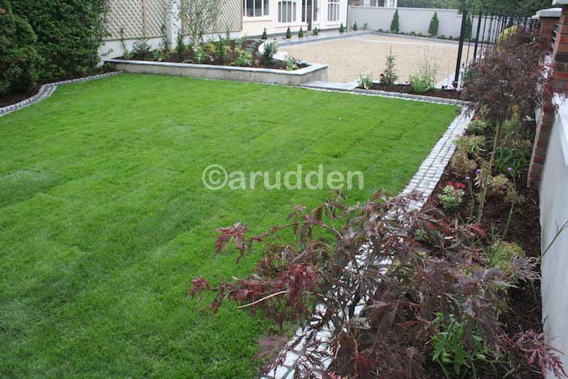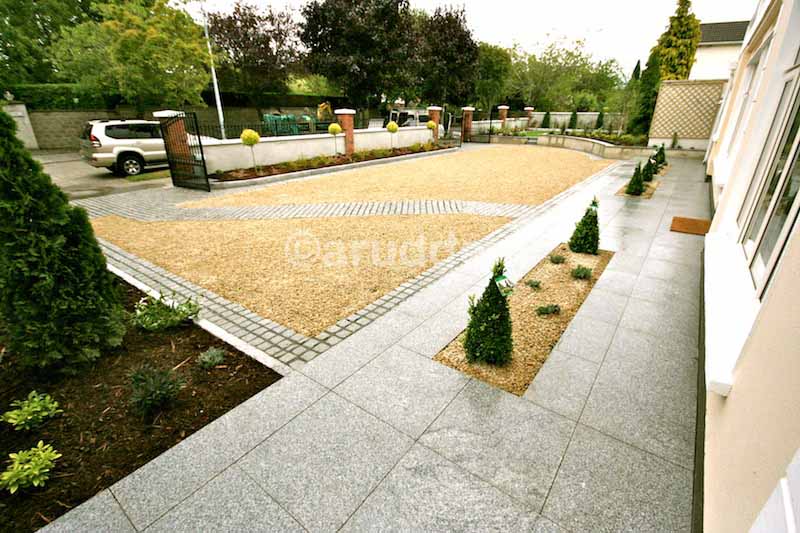 Ballylusk gravel driveway with silver granite cobble trim, kerb stones and bullnose step details. Electric swing gates. Raised lawn area with traditional planting and atmospheric lighting.