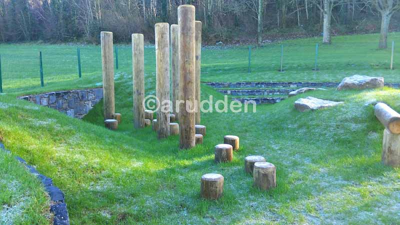 The entire ring fort will encourage creative and imaginative play. The boundary and internal grass mounding will encourage running and hiding games. The natural tree and log features such as the climbing poles, balancing beams and steps logs will not only be a fun physical challenges but will build confidants as kids play.